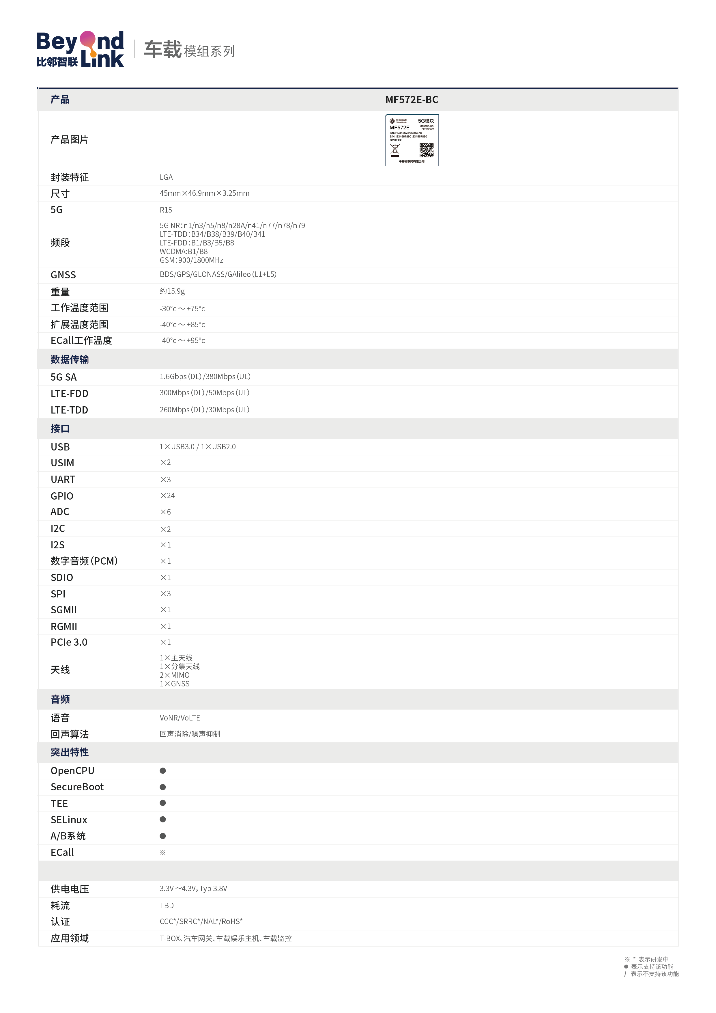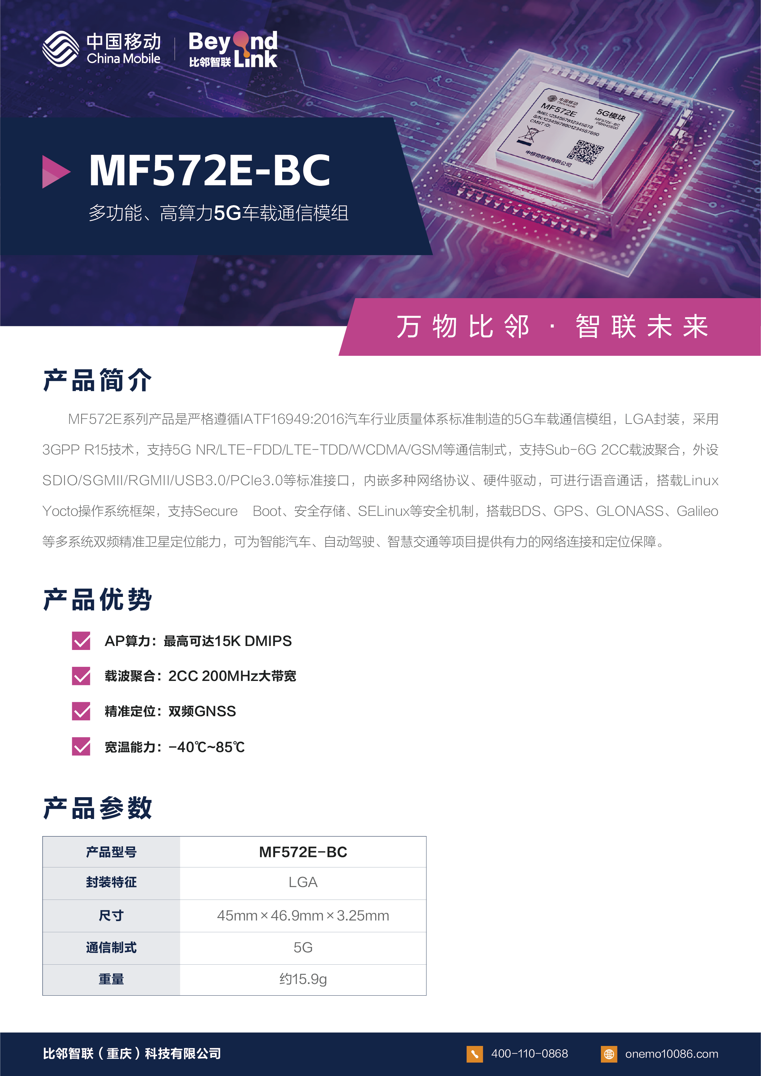 MF572E系列产品是严格遵循1ATF16949:2016汽车行业质量体系标准制造的5G车载通信模组,LGA封装,采用3GPP R15技术,支持5G NR/LTE-FDD/LTE-TDDNCDMA/GSM等通信制式,支持SuD-6G 2CC载波聚合,外设SDIO/SGMI/RGMIIUSB3.0/PCle3.0等标准接口,内嵌多种网络协议、硬件驱动,可进行语音通话,搭载LinuxYocto操作系统框架,支持Secure Boot、安全存储、SELinux等安全机制,搭载BDS、GPS、GLONASS、Galileo等多系统双频精准卫星定位能力,可为智能汽车、自动驾驶、智慧交通等项目提供有力的网络连接和定位保障。