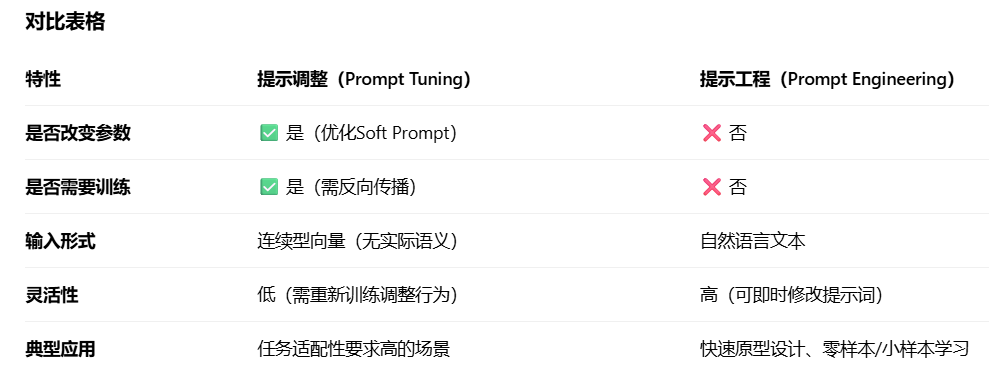 - 提示工程≠提示微调 ,提示工程与提示调整的区别: