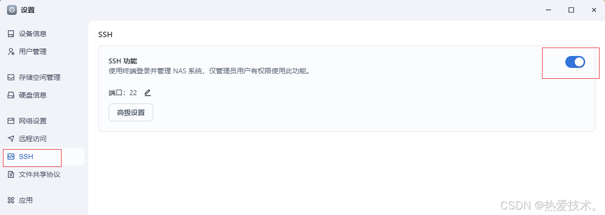 飞牛云是基于Linux的,我们可以采用cpolar 的Linux方式安装,打开飞牛云NAS设置界面,开启ssh 连接,端口默认为22即可,开启后,我们就可以ssh 连接飞牛云NAS执行命令.