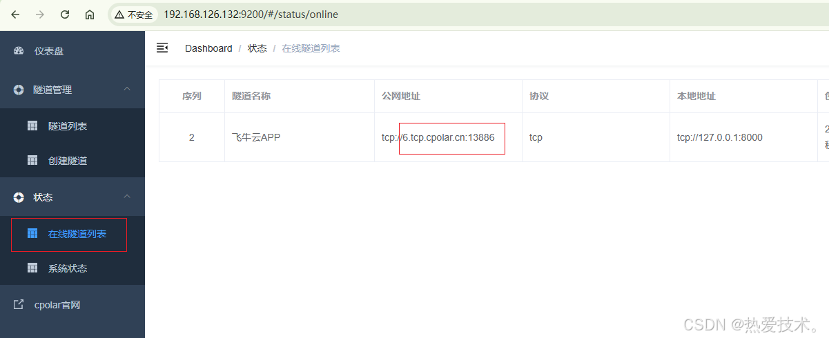 隧道更新成功后,点击左侧仪表盘的状态------在线隧道列表,可以看到公网地址已经更新成为了和我们在官网固定的TCP地址和端口一致。这样表示地址已经成功固定了,下面测试固定地址连接