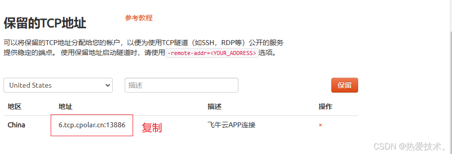 上面步骤在cpolar中使用的是随机临时tcp端口地址,所生成的公网地址为随机临时地址,该公网地址24小时内会随机变化。为了方便后续连接,我们接下来为其配置固定的TCP端口地址,该地址不会变化,设置后将无需每天重复修改地址。