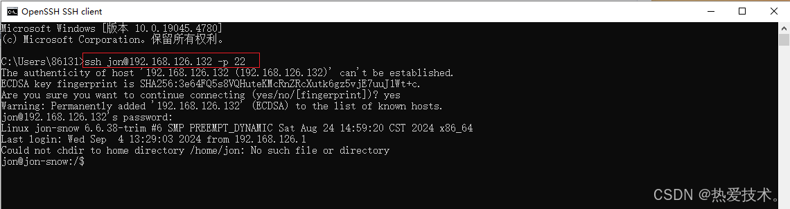 然后我们通过局域网IP ssh连接飞牛云远程连接进去,ssh连接格式:`ssh 用户名@局域网IP -p 端口`