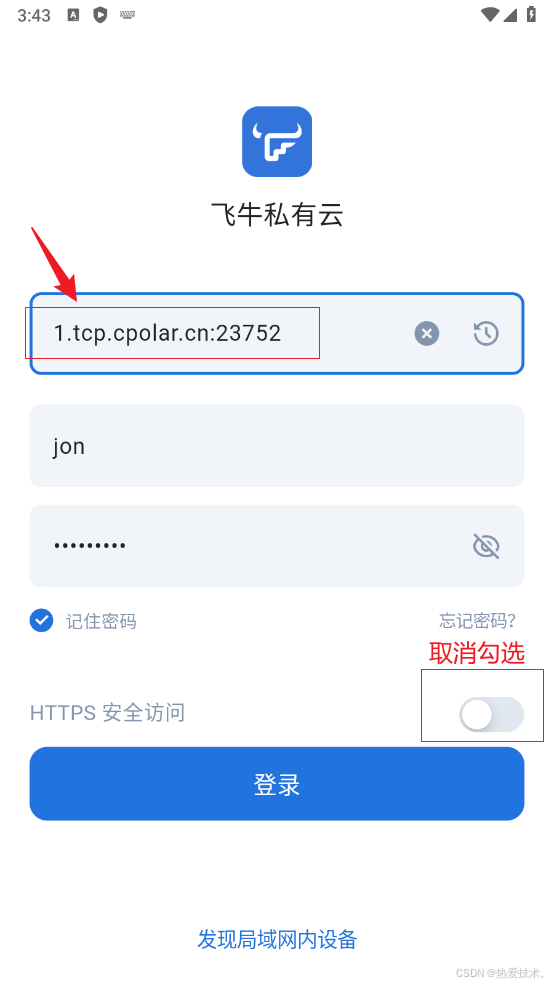 打开手机飞牛云APP,输入我们在cpolar创建的公网TCP地址,再输入账号密码,记得一定要取消勾选https,然后点击登录
