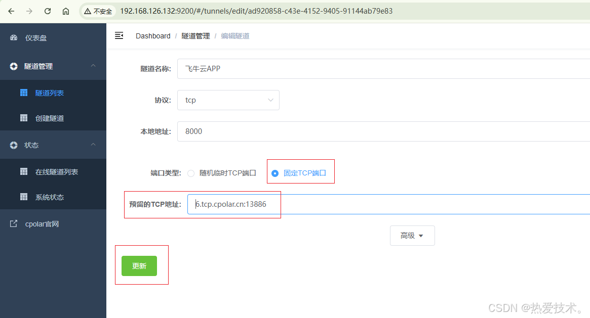 修改隧道信息,将保留成功的固定tcp地址配置到隧道中