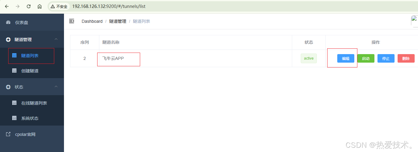 再次打开cpolar web ui管理界面,点击左侧仪表盘的隧道管理------隧道列表,找到我们上面创建的TCP隧道,点击右侧的`编辑`