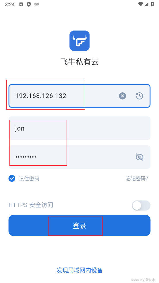 打开飞牛云手机APP,输入我们看到的局域网IP,注意,手机需要和飞牛云NAS连接同一个网络才能连接,再输入用户名和密码,输入完成点击登录