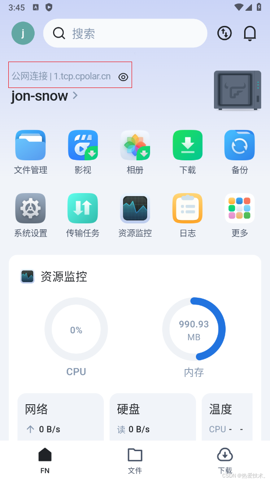 然后我们可以看到成功连接上了飞牛云NAS,无公网实现了远程连接,特别方便,这样一个远程连接的地址就设置好了.