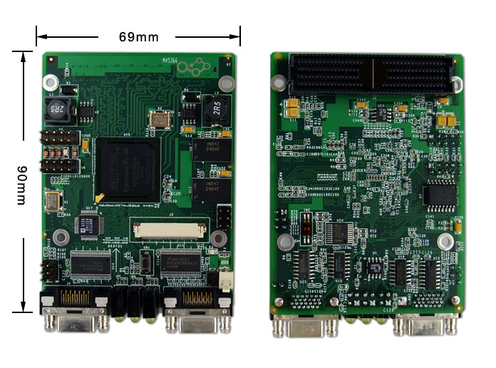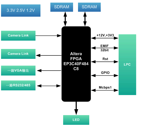 高运行时钟高达300MHz 。该性能已经满足本系统的要求。 (2) FPGA图像缓存SDRAM: 选用两片大容量的SDRAM,MT48LC16M16A2 (4 Meg x 16 x 4 banks)独立挂接在FPGA上,可以构成乒乓操作,也可以组合成大存储空间。 (3) 接口设计 (a) FPGA外接2路RS232串口, (b) FPGA外接 一路Camera Link输入和一路Camera Link输出,Camera Link 支持Base 模式 (c) FPGA外接1路VGA输出,支持PAL、NTSC模式。 3、软件功能: (a) 支持FPGA程序JTAG,AS模式配置。 (b) 支持FPGA的CameraLink图像输入\输出,RS232/485信号传输 (c) 支持FPGA的 SDRAM数据读写。 4 、 物理特性 储存温度:-20℃~ +70℃ 存储温度:商业级0℃~ +55℃ ,工业级 -40℃~ +70℃ 工作湿度:10%~80% 5 、供电要求: 直流电源供电。电压: +12V。总功耗15W。 6 、应用领域: 智能图像分析高速数据、视频信号检测,分析。