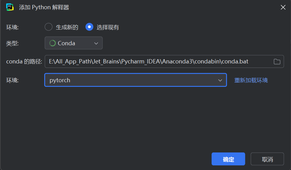 参考第二篇的内容,这次选择conda路径会自动填充,环境选择创建的,点击确定,这样就创建好了