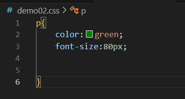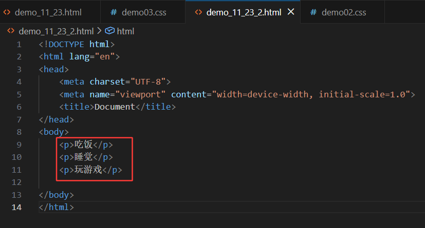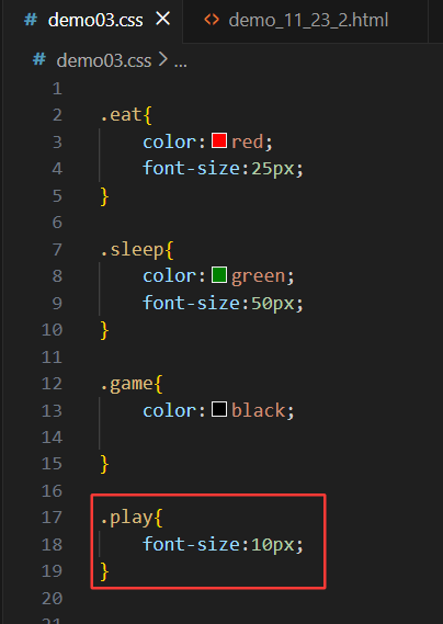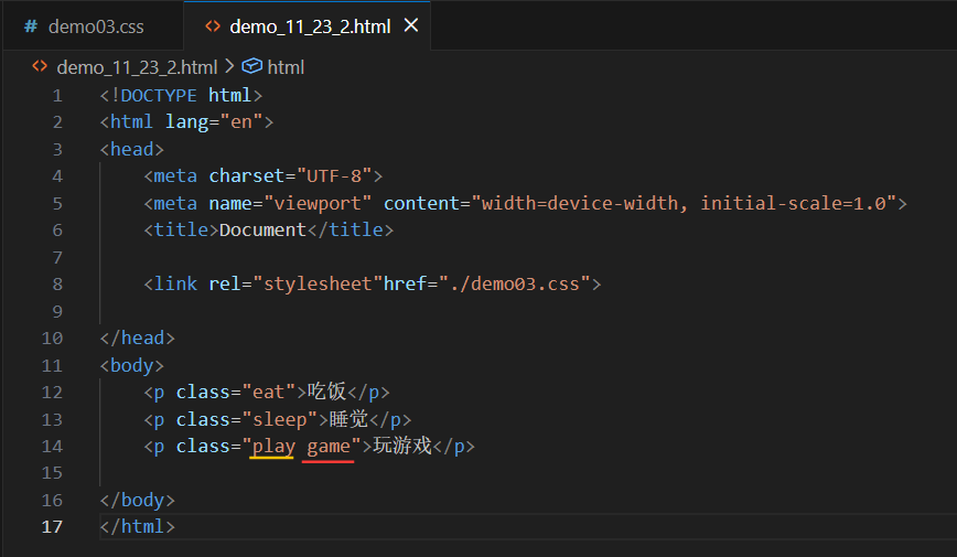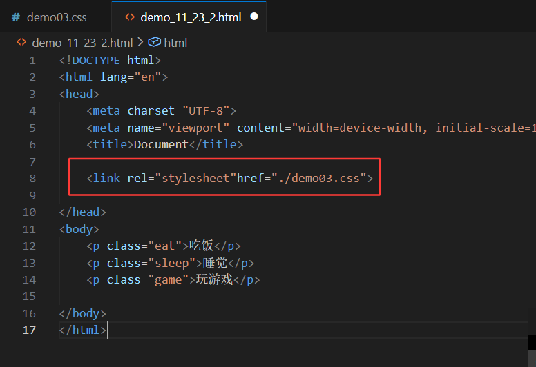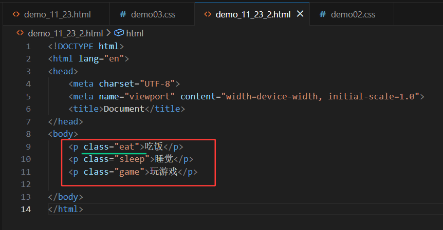 如上图中所示的勾画的绿线不分,这里就是在p标签中使用class设置了类名为eat,接下来再在另一个css结尾(即demo03.css)的文件中写如下代码: