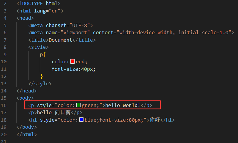 我们看到了行内样式设置的文字变成了绿色,说明: