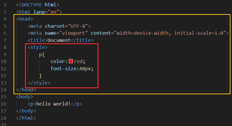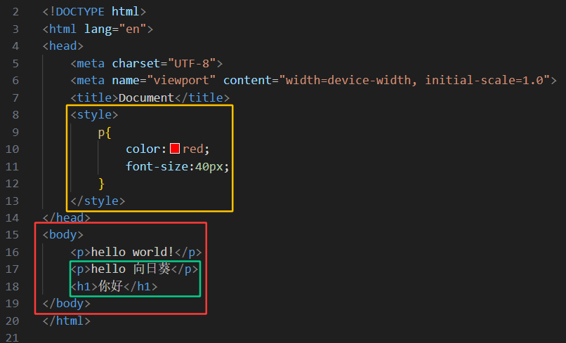 注意在图1中:使用的<style>标签大部分情况下是在<head>标签中写!(当然body标签或者是head与body标签之间,即14行15行之间也可以写),然后我们要控制哪个标签元素的展示效果呢?是p标签,所以在style里面使用到p,代码写完之后,效果展示如下: