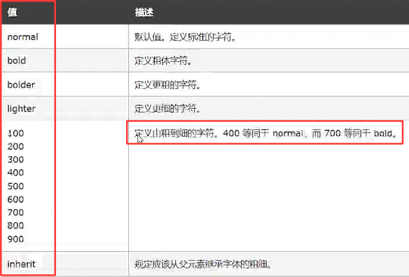 设置字体粗细用的是font-weight,同时它也是有对应的一个属性值:
