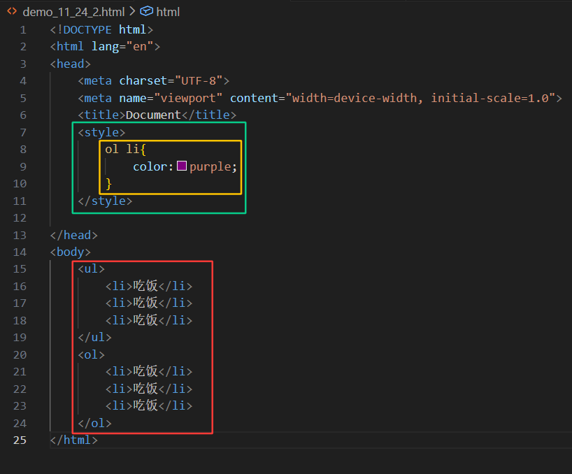直接使用内部样式表来写:内部样式中有父节点ol和子节点li,然后大括号里是样式声明