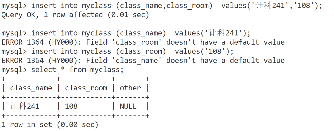 向表中插入数据时如果不给带有默认值的字段赋值,那么就会使用默认值进行插入