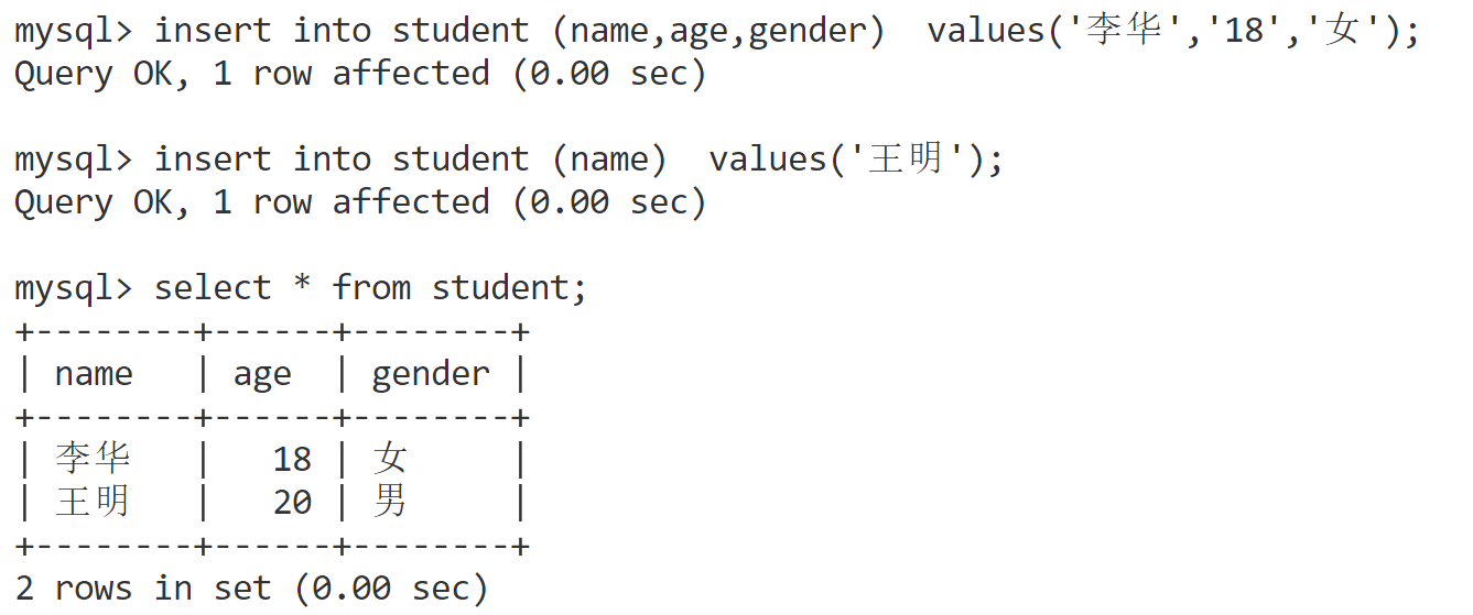 在此表中,age 默认值为20,gender默认值为"男";当插入数据时,如未指定这些列的值,将使用默认值,如下: