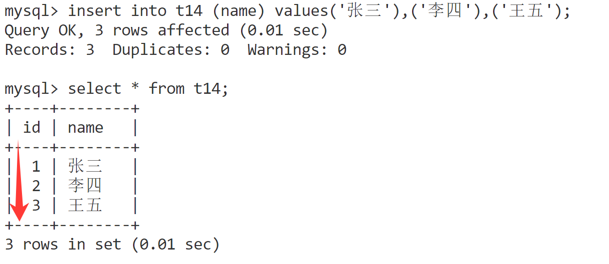 在此示例中,id 列自增长,无需显式插入,系统自动为其赋值
