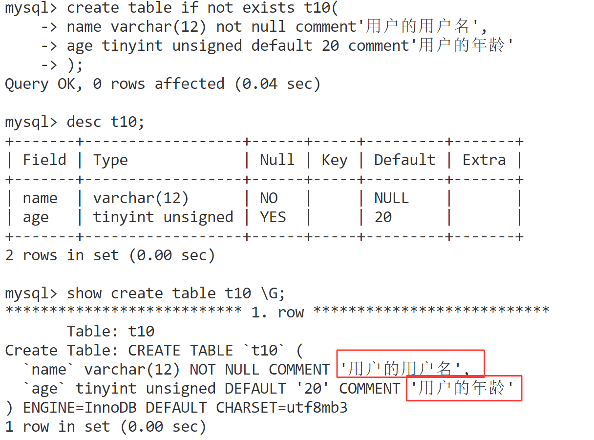可以得知的是通过desc查看不到注释信息,但是通过show查看创建该表的详细 SQL 语句时可以看到注释信息