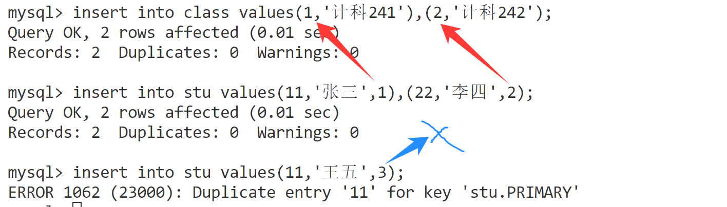 mysql> insert into class values(10, '高三(9)班'),(20, '高三(19)班');