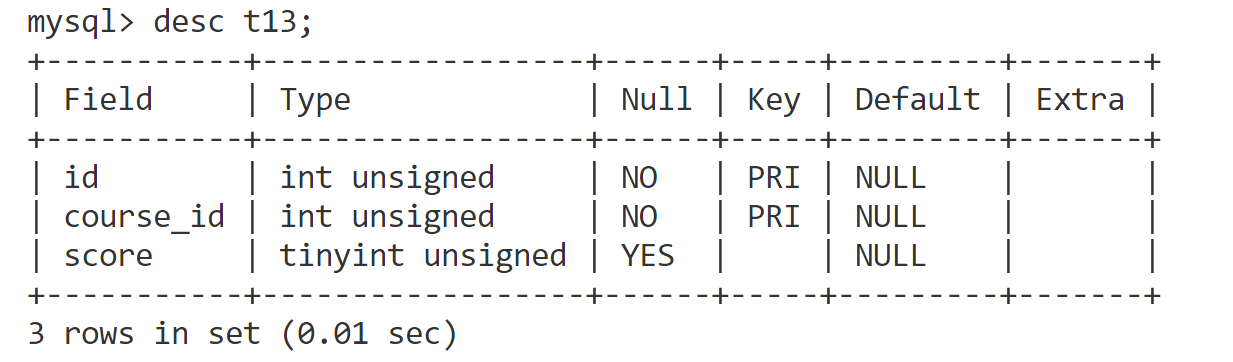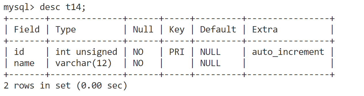 在此示例中,id 被设为主键,数据库自动为主键列添加 not null 约束。