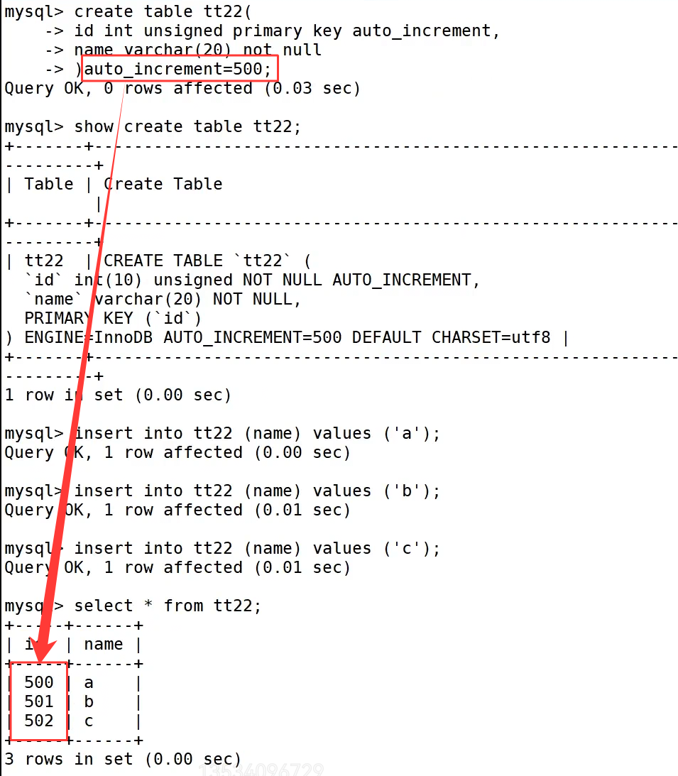 创建表时,除了在表内设置 auto_increment约束外 ,还可以在表外 设置auto_increment 的值,这代表下一次插入的起始值。