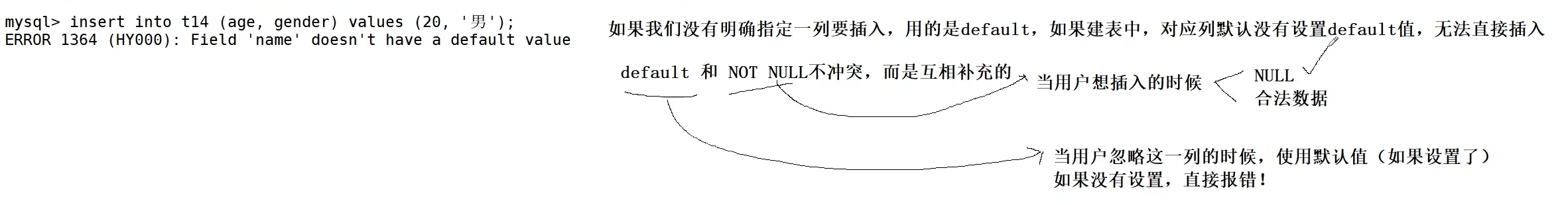 当用户忽略这一列的时候,如果设置了默认值使用默认值,如果没有就直接报错;总之用户忽略这一列要插, default 来约束