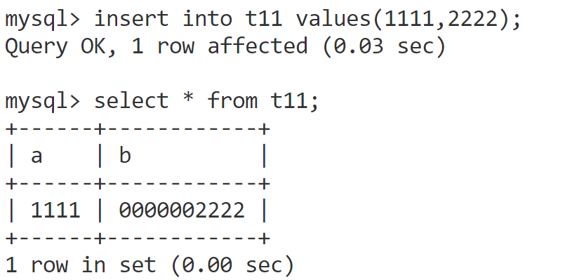 我们会发现,zerofill 还是挺形象的,格式就是填满0,这就是zerofill属性的作用,如果宽度小于设定的宽度(这里设置的是10),自动填充0。要注意的是,这只是最后显示的结果,在MySQL中实际存储的还是1 ------如果以后你想显示出的是001,002就可以设置zerofill(用来控制不够的位数补全)。