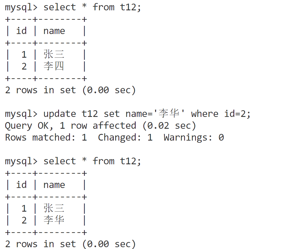 mysql> insert into stu values(100, '张三', 10), (101, '李四', 20);