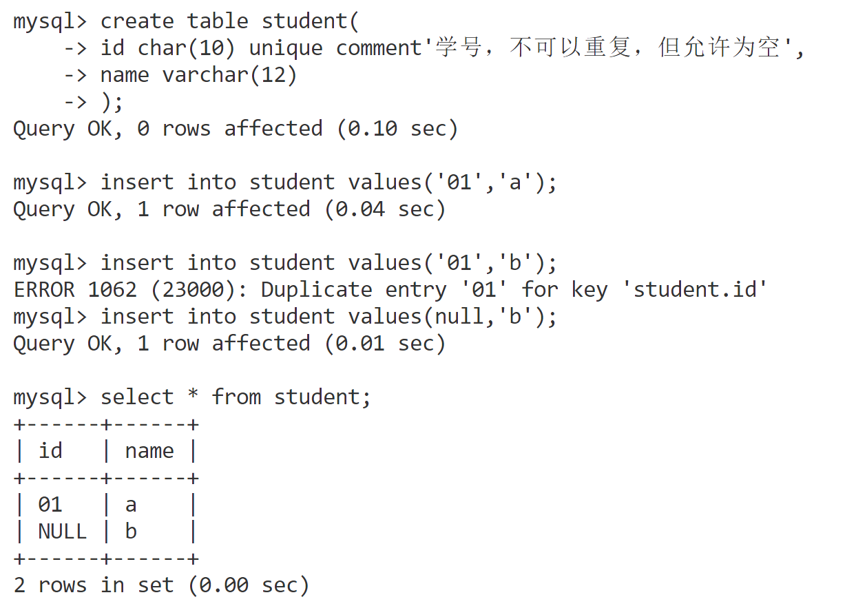 -> id char(10) unique comment '学号,不能重复,但可以为空',