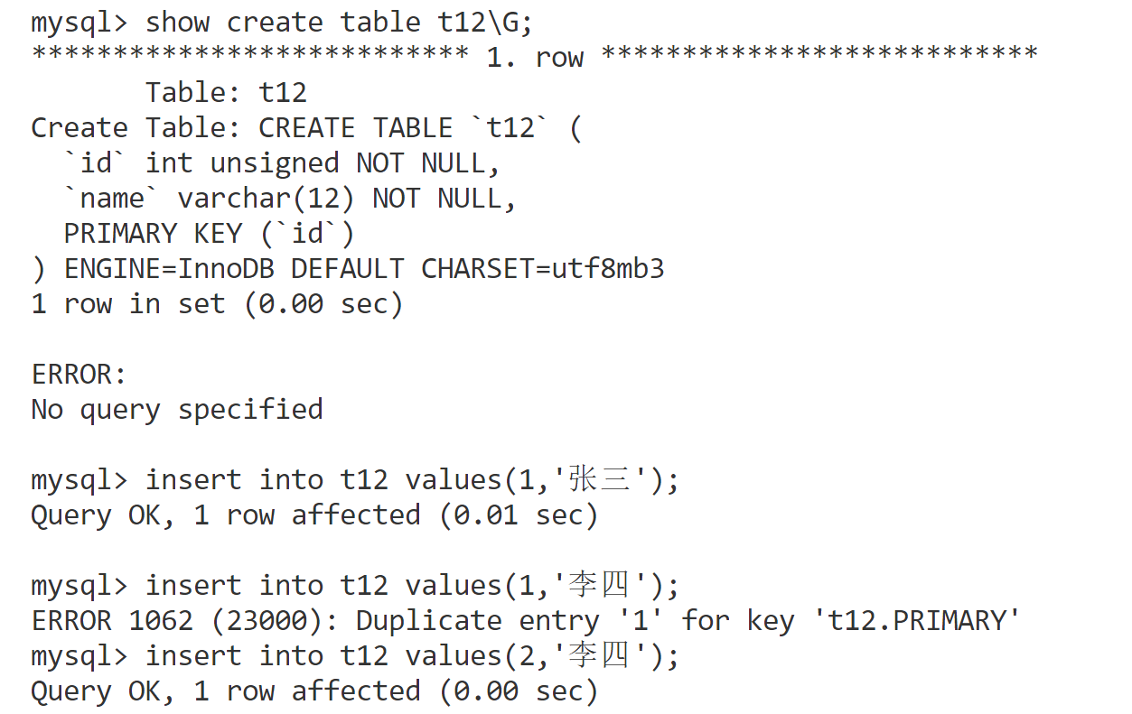 mysql> insert into student(id, name) values('01', 'bbb'); -- 触发唯一约束错误
