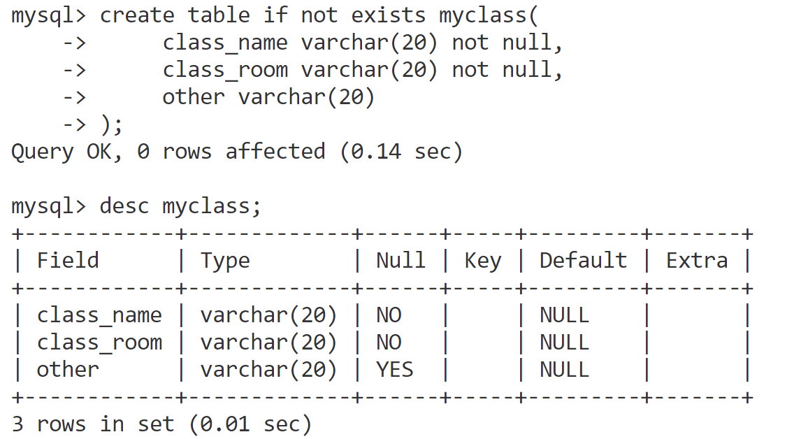 可以看到的是前两个字段我们设置了not null,那么在这里就会显示出来,表示我们是必须插入具体值得;而我们的这个other字段是没有设置not null的,默认是 null 的,所以这里后面跟的是default null,表示你想插就插,不插这一类就给默认值null。
