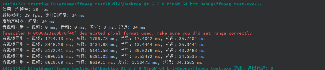 qDebug() << "音视频同步信息 - 视频时钟:" << video_pts * 1000 << "ms, 音频时钟:"
