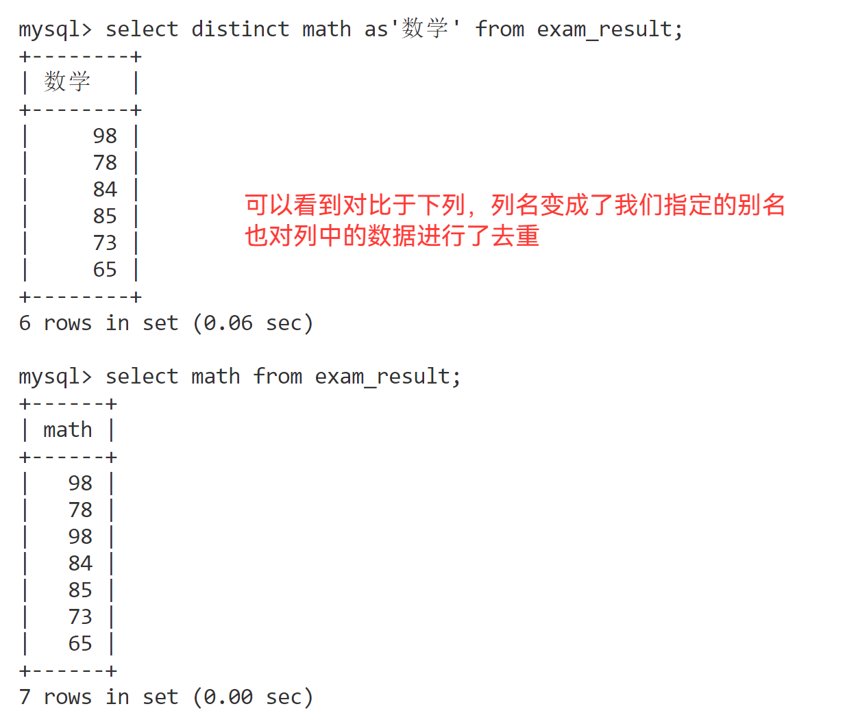 结合一下如果今天我们需要将表中math去重并指定其别名为'数学'之后查找出来,那么就是:
