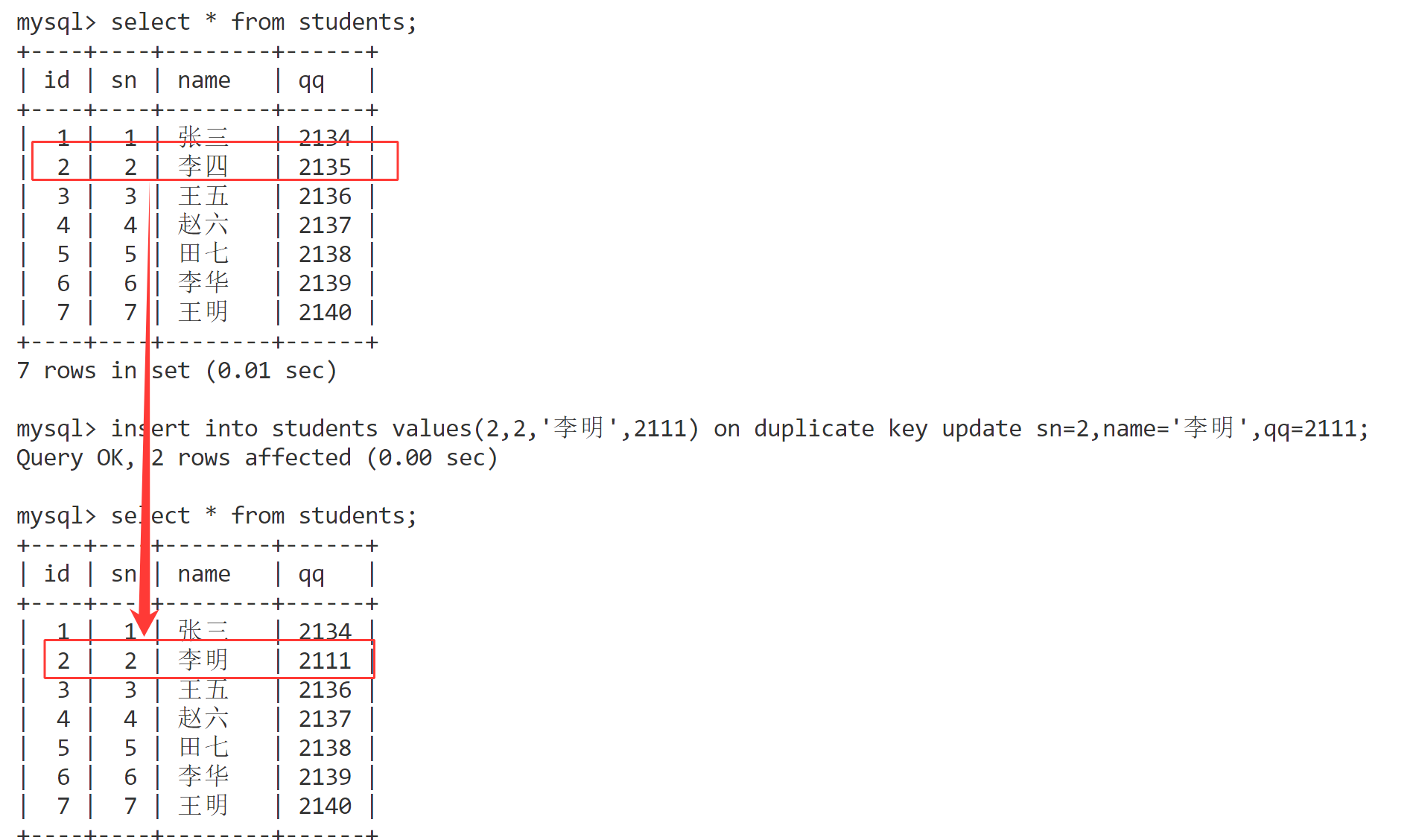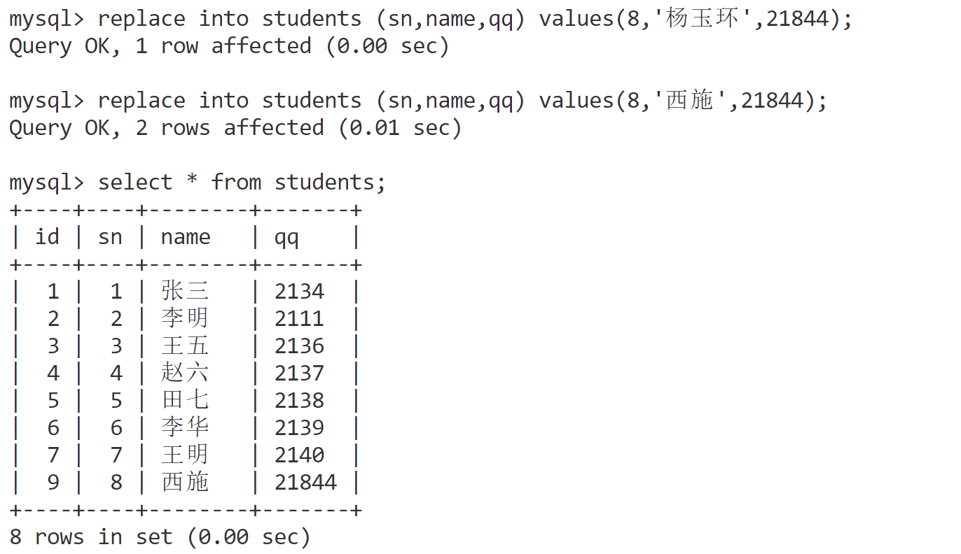 REPLACE INTO students (sn, name, qq) values (8, '杨玉环', '21844');