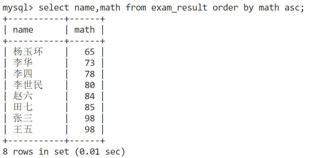select name,math from exam_result order by math asc;