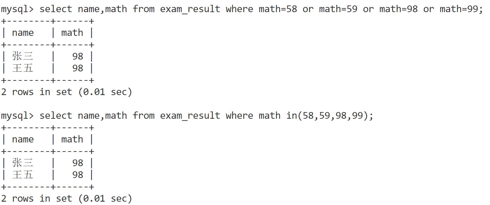 select name,math from exam_result where math in(58,59,98,99);