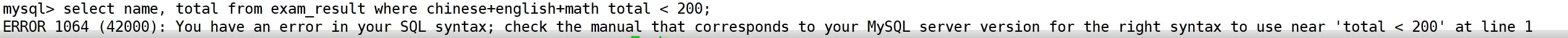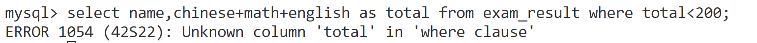 这里我们思考一个问题,我们可以看到 where 后面也有跟表达式,曾经不是说过可以对列进行重命名吗,那 where 后面还用写这么一大堆吗?我们可不可以先用as先取别名然后在where后面直接使用这个别名呢?
