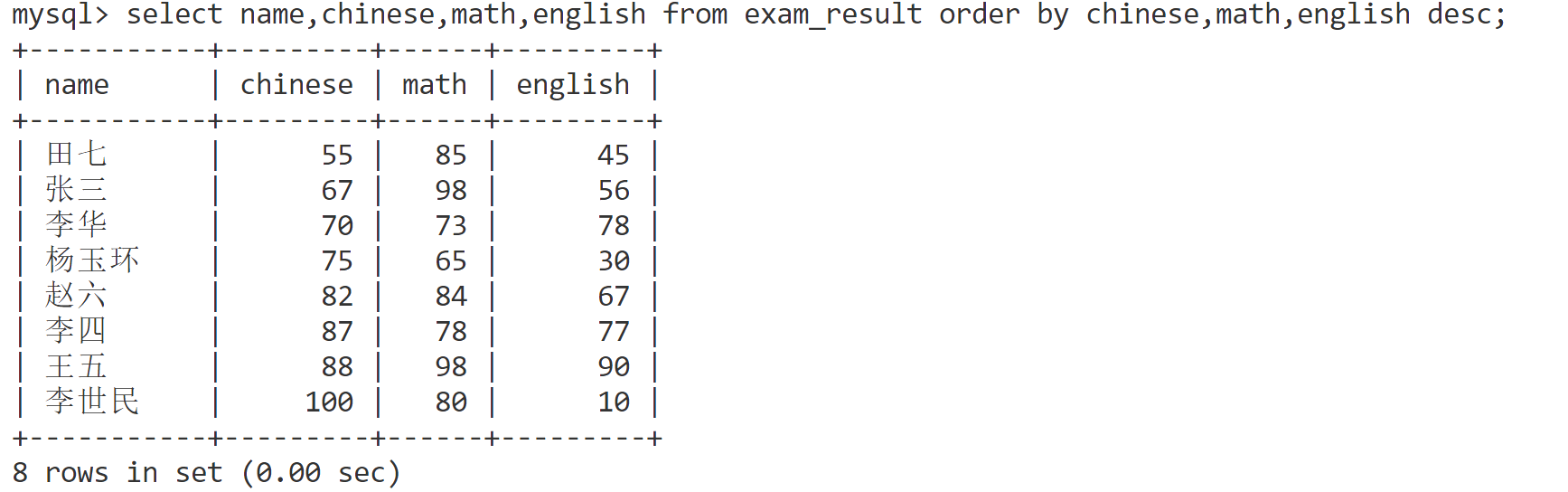 order by chinese,math,english desc;
