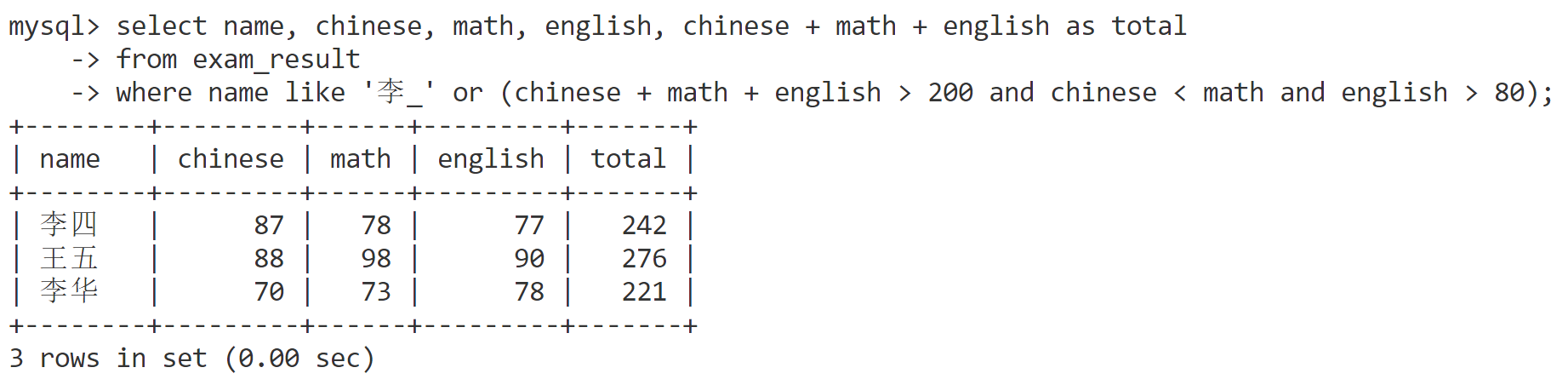 where name like '李_' or (chinese + math + english > 200 and chinese < math and english > 80);