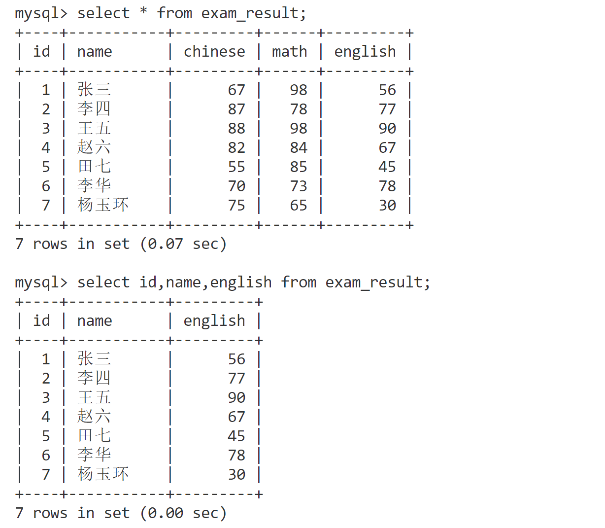 select id, name, math from exam_result;