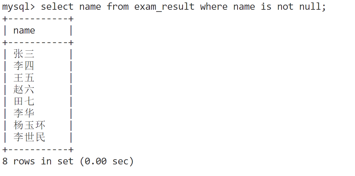 select name from exam_result where name is not null;