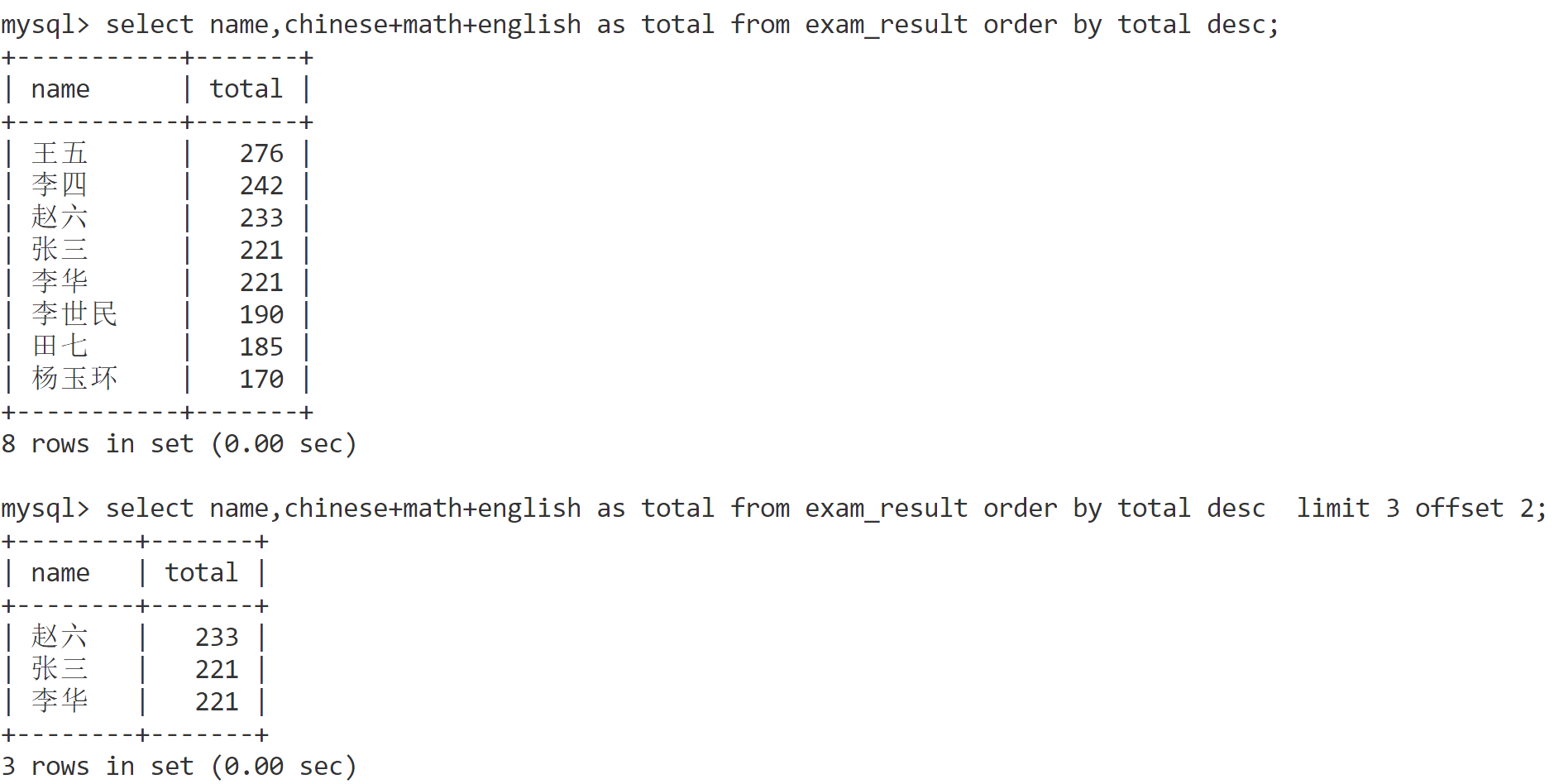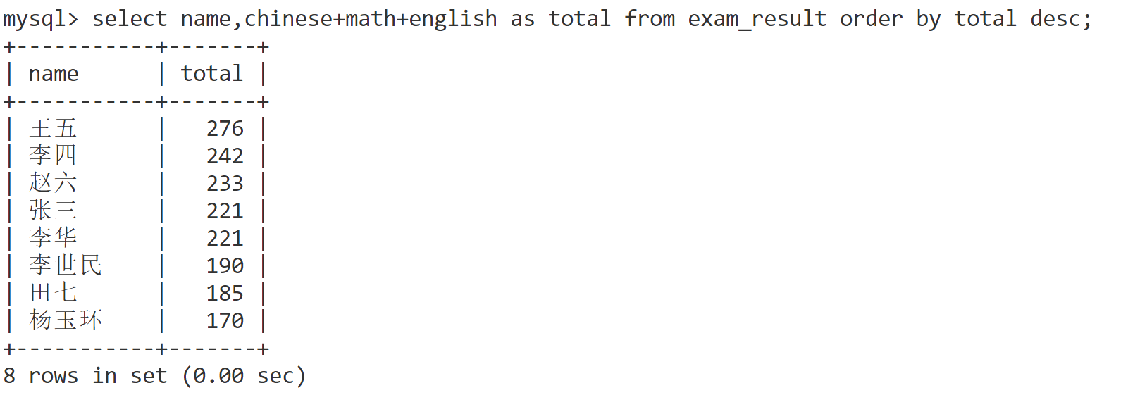 select name,chinese+math+english as total from exam_result order by total desc;