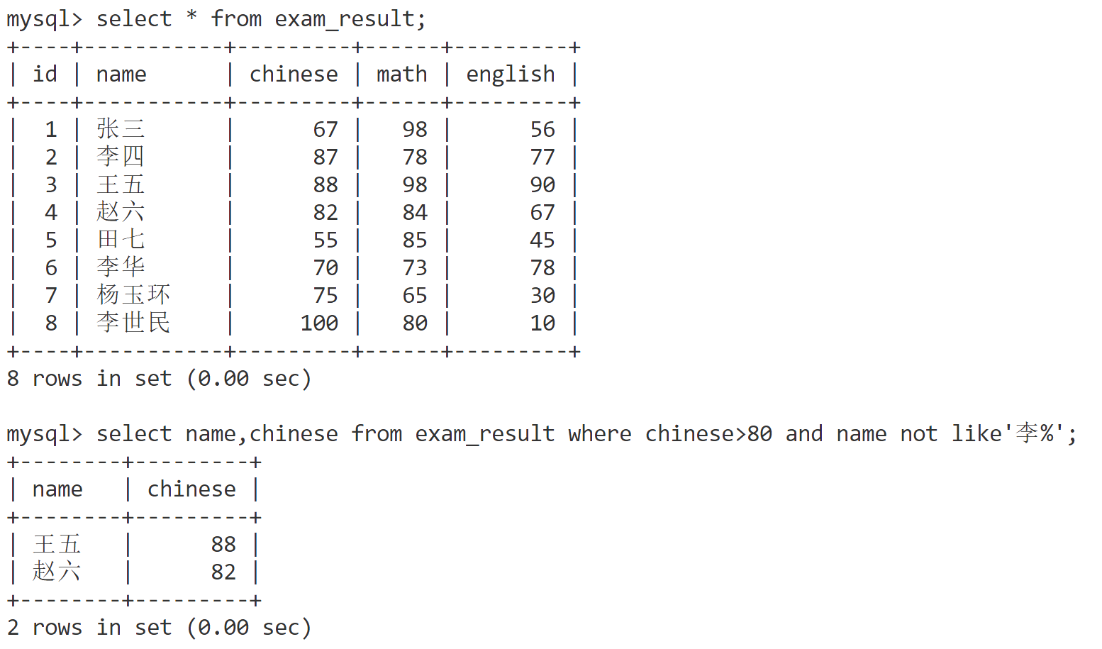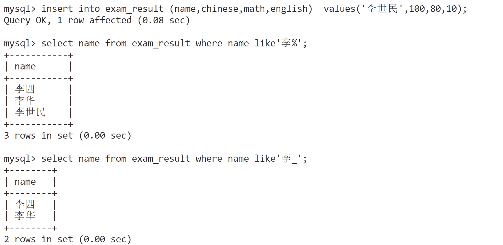select name from exam_result where name like '李_'; # 严格匹配一个任意字符