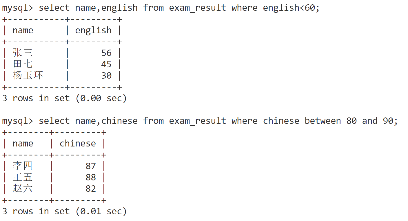 - 语文成绩在 [80, 90] 分的同学及语文成绩使用 AND 和 BETWEEN... AND... 进行条件连接