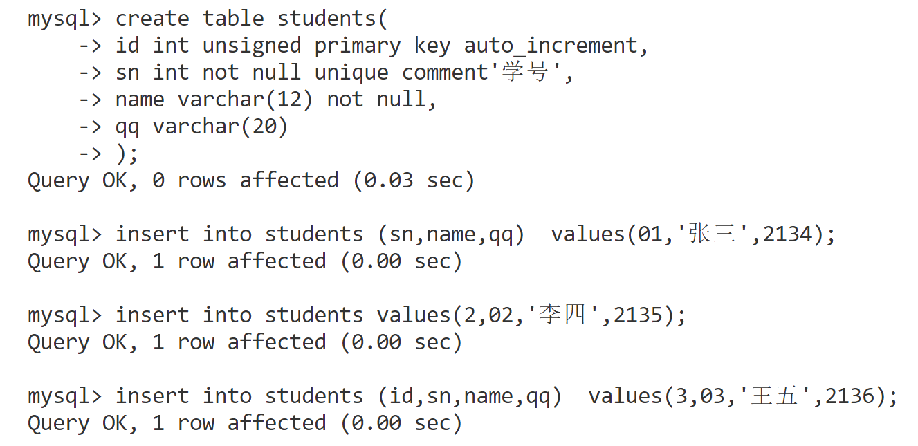 sqlinsert into students values(2,02,'李四',2135); insert into students (id,sn,name,qq) values(3,03,'王五',2136);