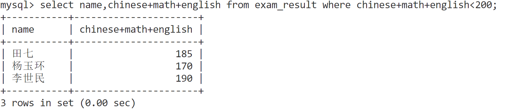 select name chinese+math+english from exam_result where chinese+math+english<200;