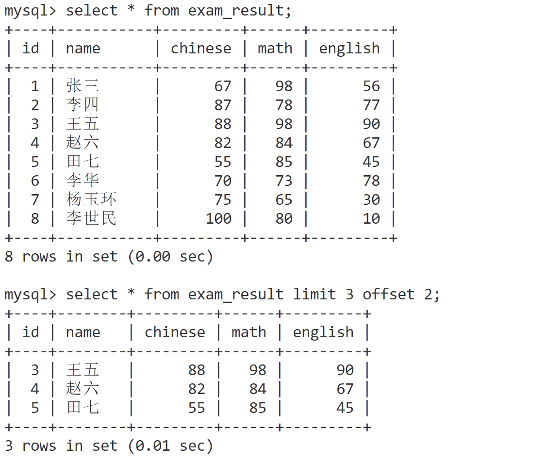 select * from exam_result limit 3 offset 2;