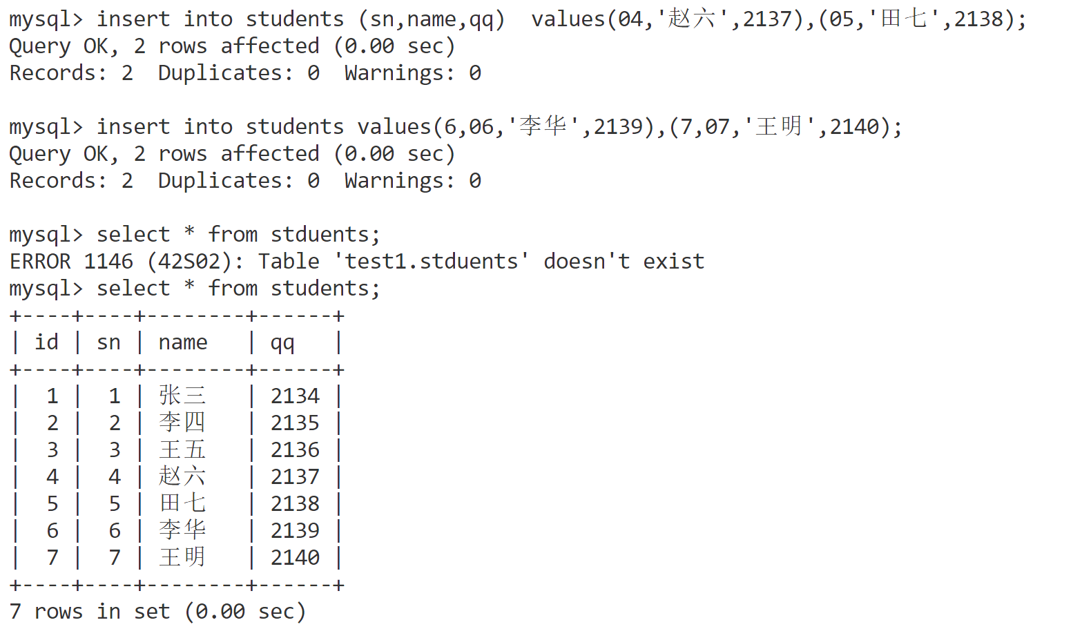 sqlinsert into students (sn,name,qq) values(04,'赵六',2137),(05,'田七',2138); -