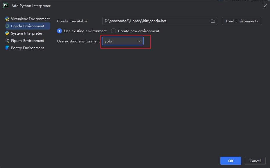 最近使用pycharm2024配置anconda环境的时候发现无法导入python。(以前的路径是D:\anaconda3\envs\yolo\python.exe)