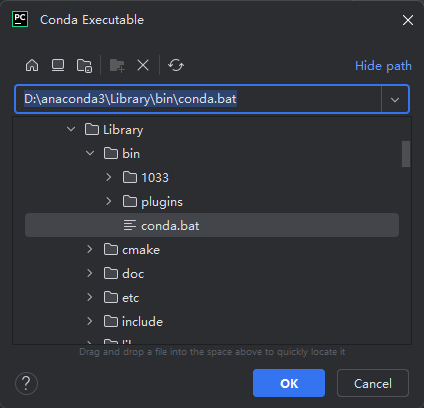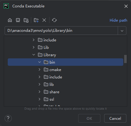 看了一些博客说现在不能直接导入了,需要导入D:\anaconda3\envs\yolo\Library\bin\conda.bat。但是我看来一下pycharm不显示这个conda.bat。
